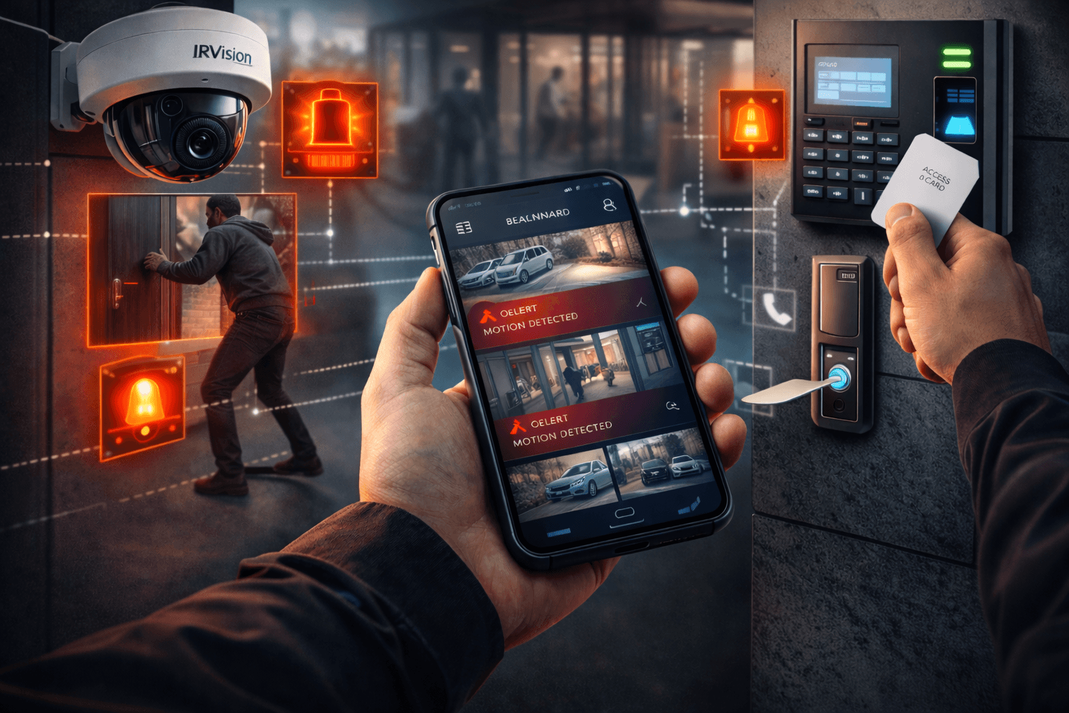 به محض ورود غیرمجاز، چند رویداد همزمان رخ میدهد: دوربین مداربسته مجهز به هوش مصنوعی حرکت را تشخیص داده و شروع به ثبت و پخش زنده تصاویر صحنه میکند؛ سیستم کنترل دسترسی ثبت میکند که در آن ساعت هیچ ورود مجازی تأیید نشده و بنابراین این ورود غیرمجاز است؛ و دزدگیر نیز آلارم را به صدا درمیآورد. تمامی این اتفاقات در کسری از ثانیه به مدیر یا نگهبان اطلاع داده میشود. او روی گوشی همراه خود یک هشدار فوری دریافت میکند که شامل تصاویر زنده دوربین مربوطه و ثبت وقایع سیستم دسترسی است. با مشاهده تصویر، بلافاصله تأیید میکند که فرد مشاهدهشده یک مزاحم است نه مثلا یکی از کارکنان، و فوراً پلیس یا تیم حراست را مطلع میکند. همه اینها در حالی رخ میدهد که فرد متجاوز هنوز سعی دارد وارد شود و پیش از آنکه خسارت یا سرقتی انجام شود، اقدامات بازدارنده صورت گرفته است. در چنین سناریویی، ادغام سیستمها عملاً از وقوع جرم جلوگیری کرده و دستگیری مجرم را بسیار محتملتر میسازد.